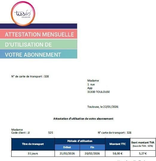 Voici un modèle du justificatif fourni par Tisséo, valable pour votre demande de remboursement